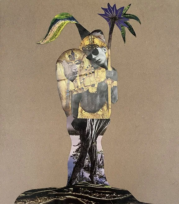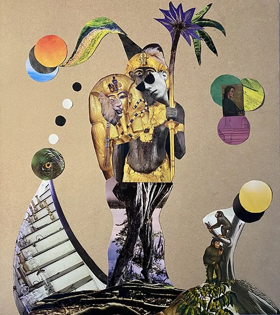 It often happens when I’m playing around with the enormous possibilities available through collage that something emerges from the chaos of my seemingly random placing of paper and grabs my attention. The first photo I take of a new image is usually a record of that moment—below is that photo of this emerging character.