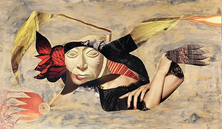 Self-Portrait V: Femme Fatale Rising, 2025, 17” x 18.5” x 1 1/2”. Prints available.
