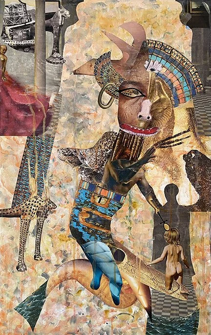 Self-Portrait VI: Reflections on Predation, 2025. Mixed-media collage with encaustic wax finish on wood panel, 19” x 19” x 1 1/2”. Prints available.