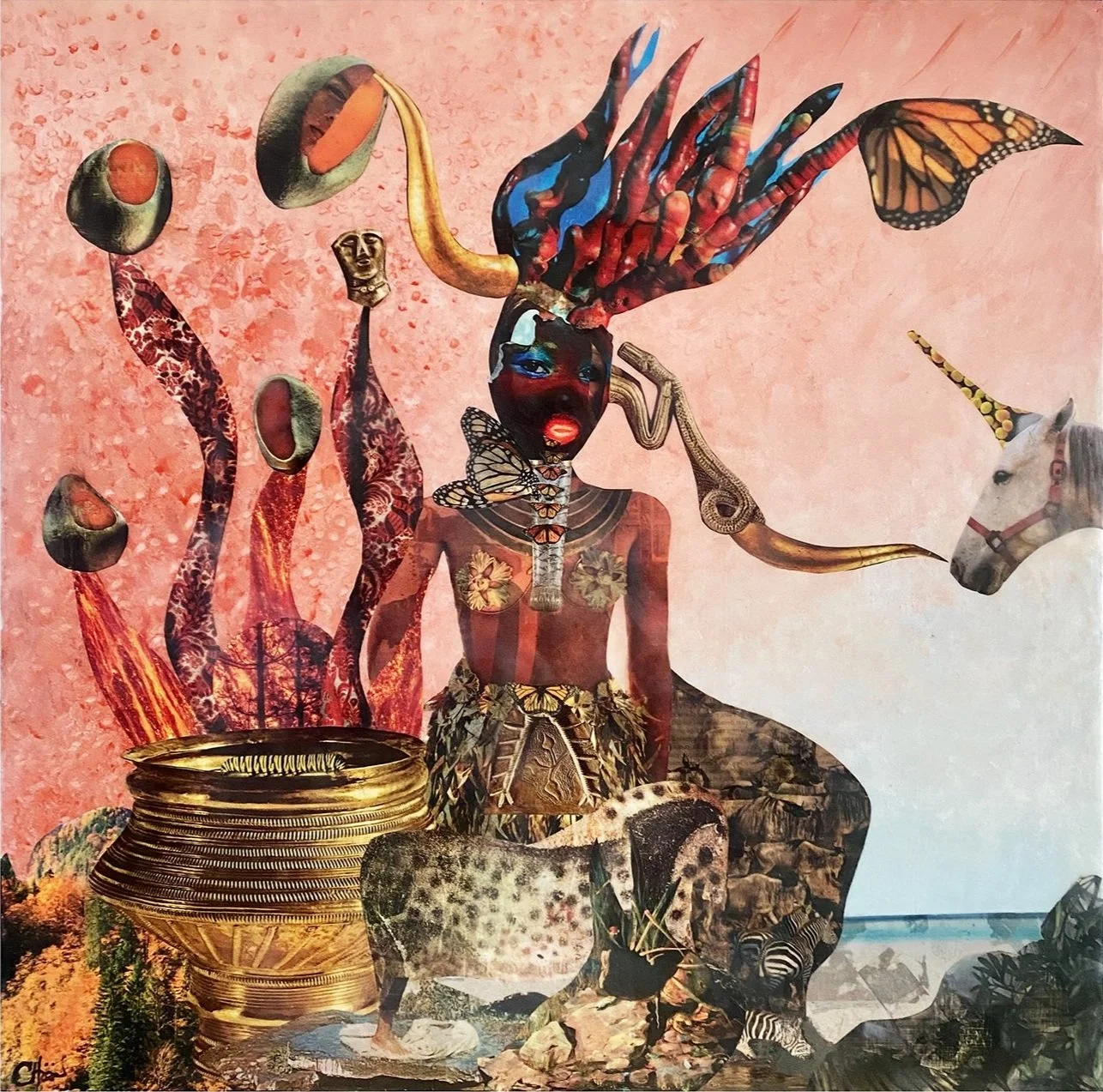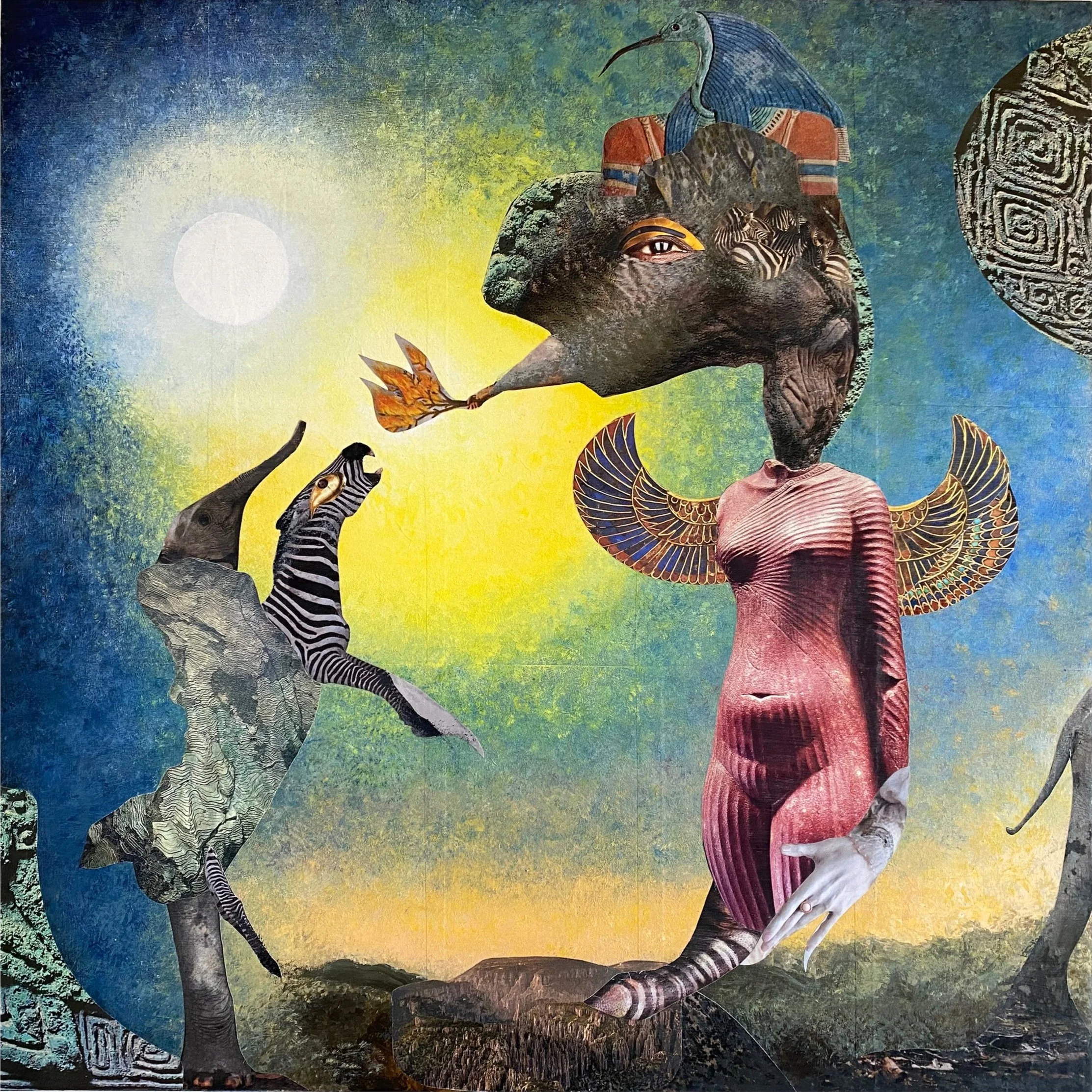 Mixed-media collage on wood box panel, 23.25” x 25.25”