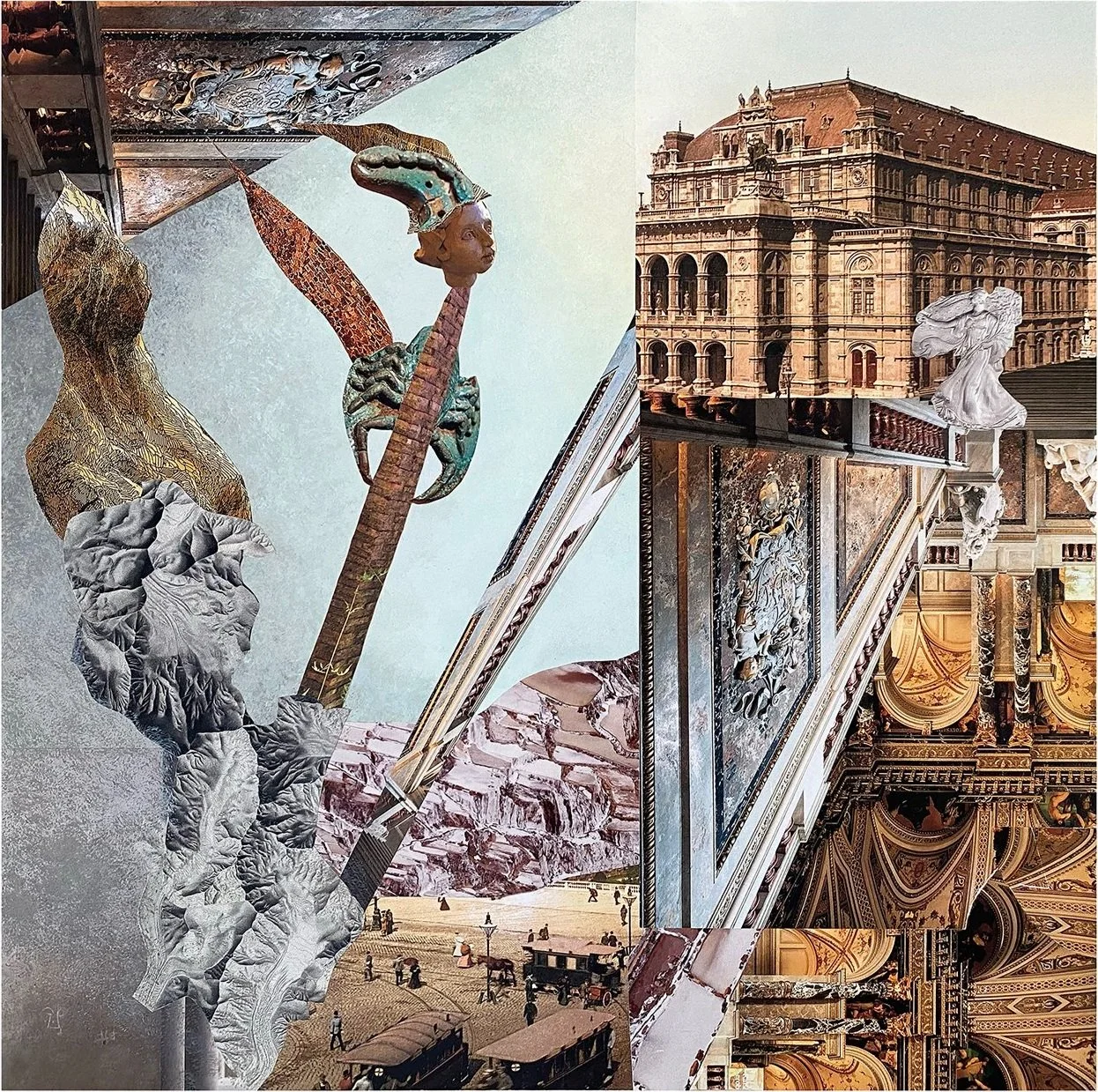 Mixed-media collage on Arches Hot Press, 140 lb. watercolor paper mounted on wood panel with encaustic wax finish, 30” x 22.5”